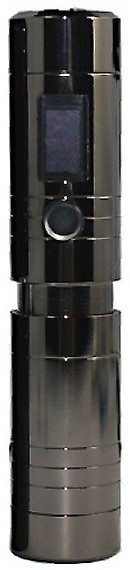 - La partie principale qui est un bloc complet. Ceci comprend le pas de vis/connecteur où on peut placer un atomiseur, le « cerveau » électronique où se trouve aussi l’écran OLED et le « switch » (semi-opaque) et le tube principal qui peut accueillir un accu 18350.